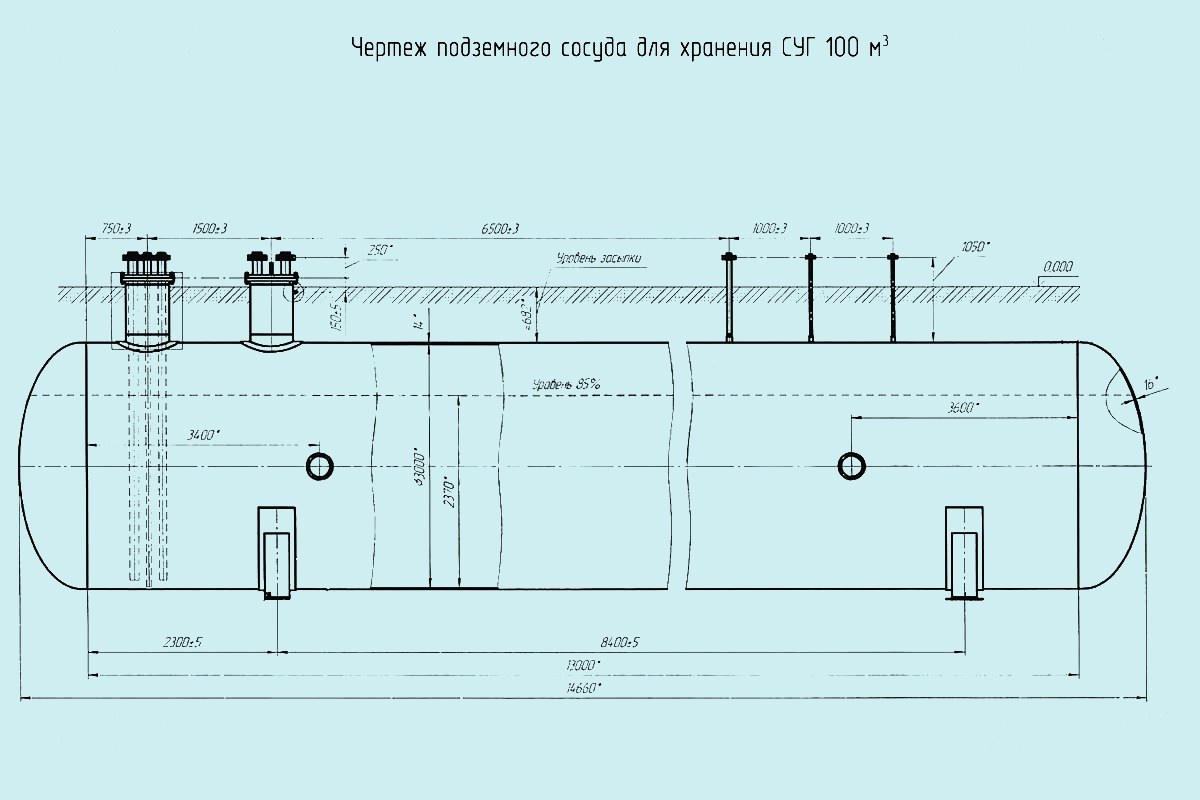 Горизонтальные, цилиндрической формы, цельносварные, стальные сосуды для СУГ имеют эллиптические торцевые части и днище. Такая форма установлена техническими требованиями для хранения газовых смесей под давлением. Толщина стального листа от 10 до 20 мм. Надежную устойчивость тяжеловесной конструкции обеспечивают опоры-ложементы.